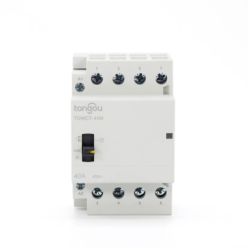 La série TOWCTH de contacteurs modulaires AC pour usage domestique est adaptée aux circuits jusqu’à la tension nominale de 400V CA 50/60Hz avec un courant nominal jusqu’à 63A, pour la réalisation, le démarrage fréquent et les dispositifs d’interlocking des machines.